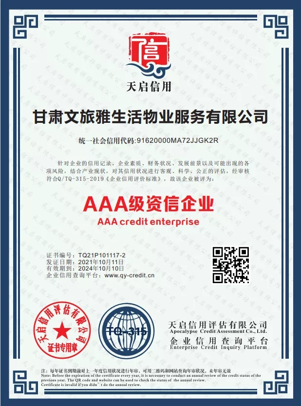 2021年,甘肅文旅雅生活物業服務有限公司認真貫徹落實習近平新時代中國特色社會主義思想,堅決落實集團公司各項決策部署。按照集團公司高質量發展要求,結合自身發展需要,公司于9月份正式啟動3A體系認證工作,經過權威認證機構對公司信用管理、制度建設、管理體系等方面綜合評估,10月底公司順利通過3A體系認證,使得公司在管理水平、制度建設方面有了進一步完善及提升,增強了公司核心競爭力和品牌影響力,為公司高質量發展奠定了堅實的基礎。