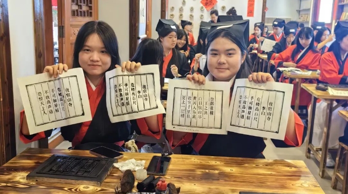 在河口古鎮(zhèn)的國學活字印刷研學館,港澳青少年們親自動手體驗了古代的活字印刷術(shù)。他們小心翼翼地擺放著字模,用墨汁輕輕刷過,再將宣紙覆蓋其上,輕輕一壓,一幅幅唐詩便躍然紙上。他們齊聲用粵語朗誦了“憫農(nóng)”“春曉”“相思”等經(jīng)典唐詩,不僅領(lǐng)略了民間藝術(shù)的獨特魅力,更在實踐中感受到了中華文化的博大精深。